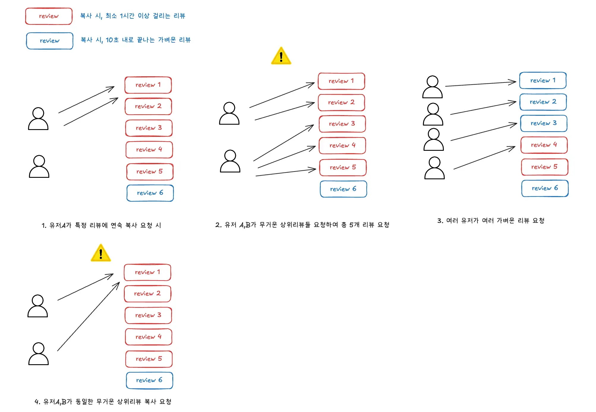 하지만 4번은 상위리뷰아이디:유저아이디 키로 선택할 경우 아래 상황이 발생할 수 있고, 충분히 있을 수 있는 일입니다.